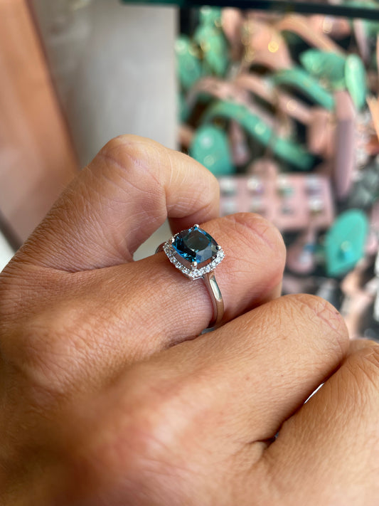 9ct White Gold Cushion Cut London Blue Topaz & Diamond Ring