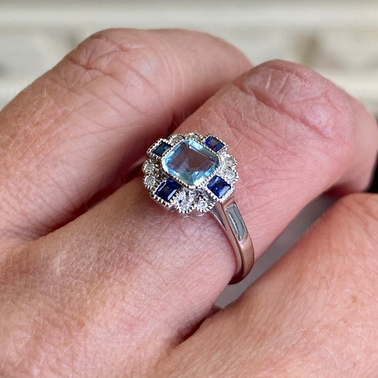 9ct White Gold Aquamarine, Sapphire & Diamond Ring