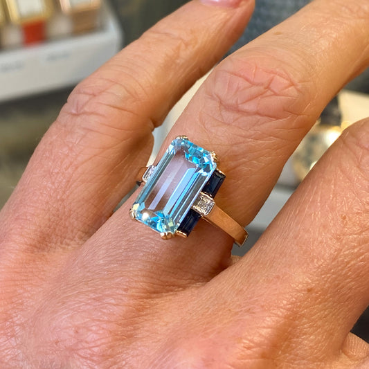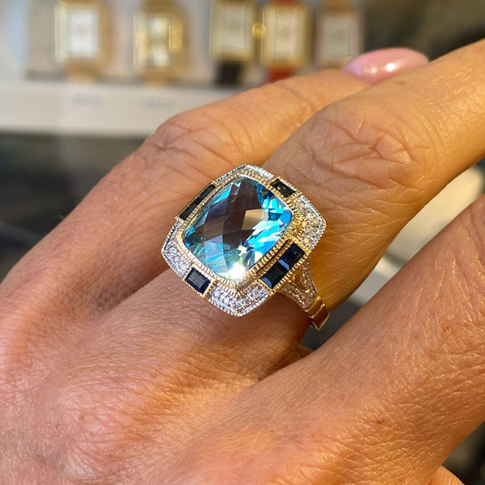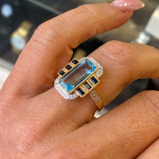 9ct Gold Blue Topaz, Sapphire & Diamond Deco Ring