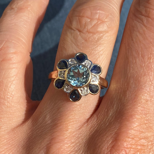 9ct Gold Blue Topaz, Sapphire & Diamond Ring