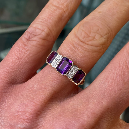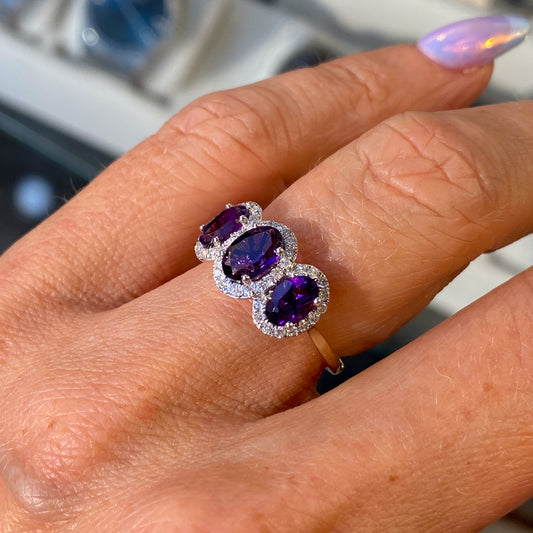 9ct Gold Amethyst & Diamond Oval Garland Ring