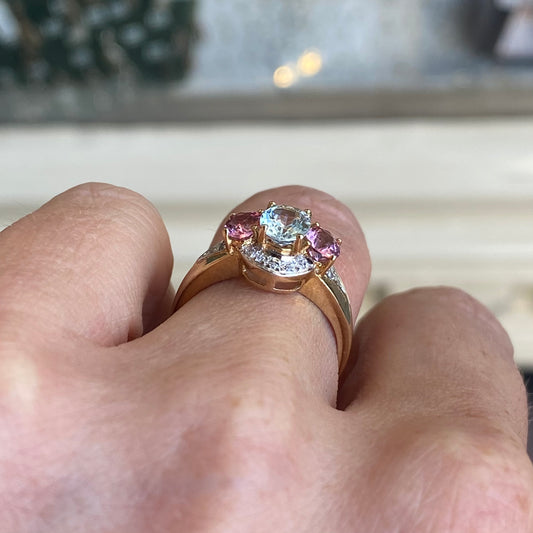 9ct Gold Aquamarine, Pink Tourmaline & Diamond Ring