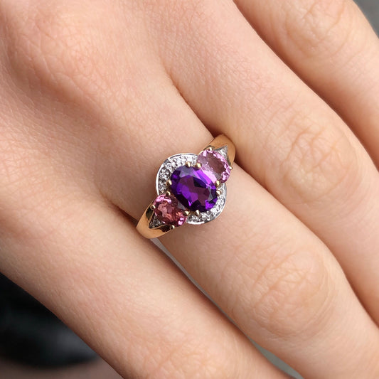 9ct Gold Amethyst, Pink Tourmaline & Diamond Ring