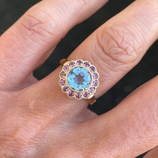 9ct Gold Blue Topaz & CZ Vintage Style Ring