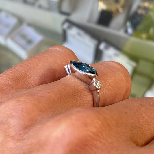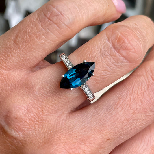 9ct White Gold Marquis Cut London Blue Topaz & Diamond Ring