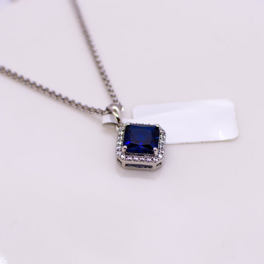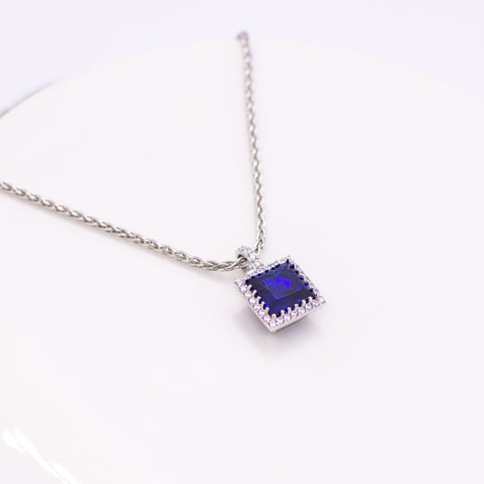 Silver Created Sapphire & CZ Square Halo Pendant Necklace