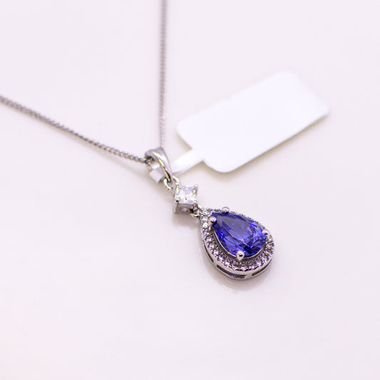 Silver Created Tanzanite & CZ Pear Halo Pendant Necklace