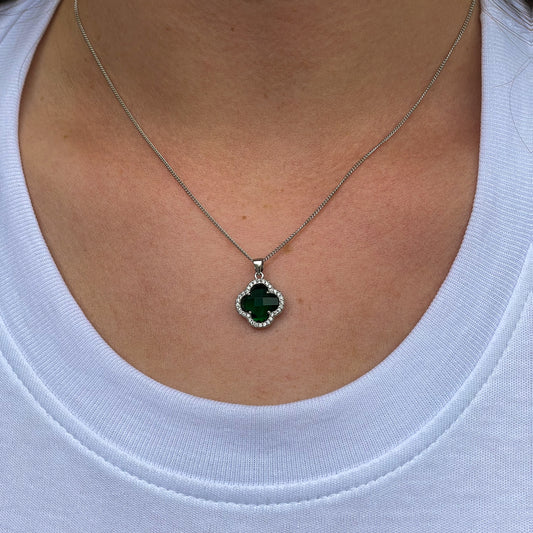 Silver CZ Quatrefoil Earring & Necklace Set | Emerald Green