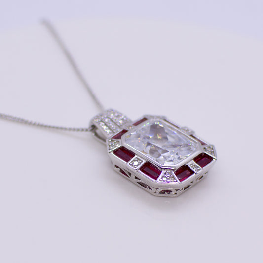 Silver CZ Rectangular Pendant Necklace - Created Ruby