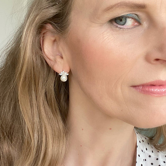 Silver CZ Simulated Pearl Stud Earrings