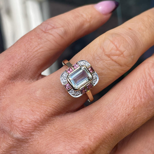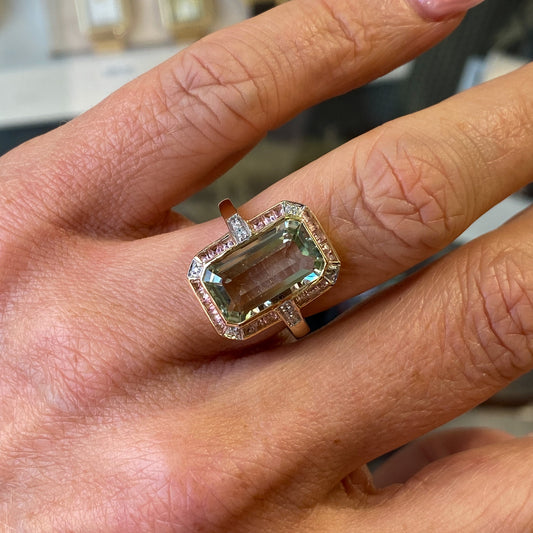 9ct Gold Green Amethyst, Pink Tourmaline & Diamond Ring