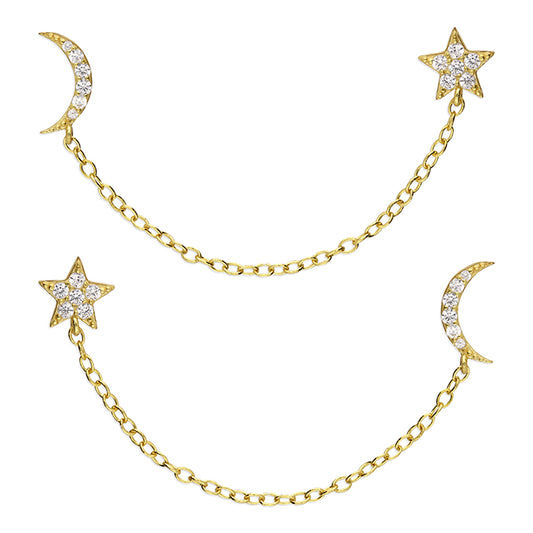 Sunshine Double Moon & Star & Chain Stud Earrings