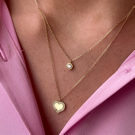 9ct Gold Double Necklace | CZ& CZ Heart Disc