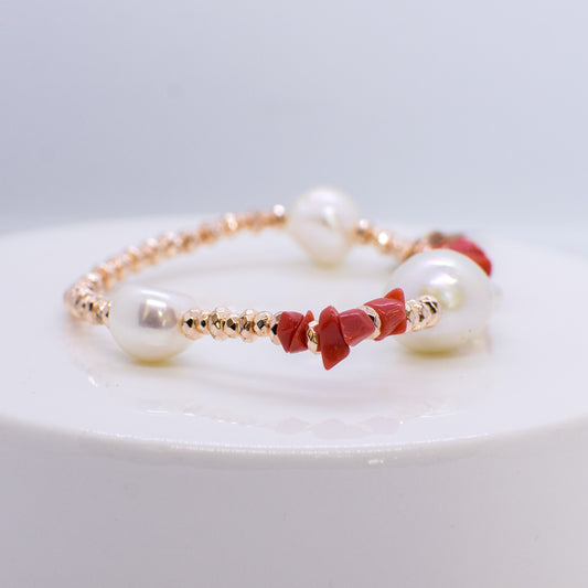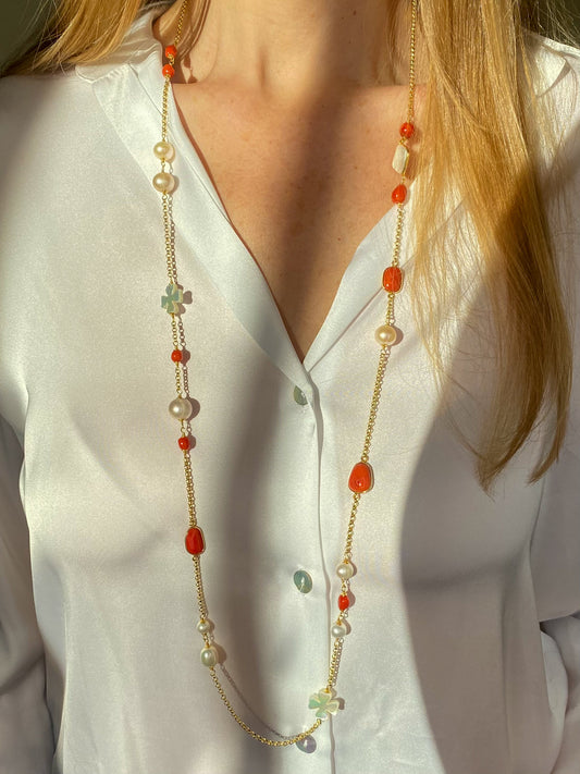 Natural Beauty - Mother of Pearl, Red Coral & Freshwater Pearl Necklace |100cm