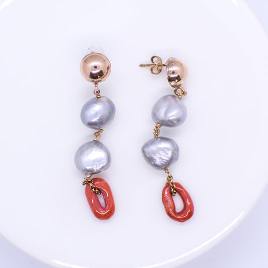 Sold outGrey Pearl & Red Coral Drop Earrings