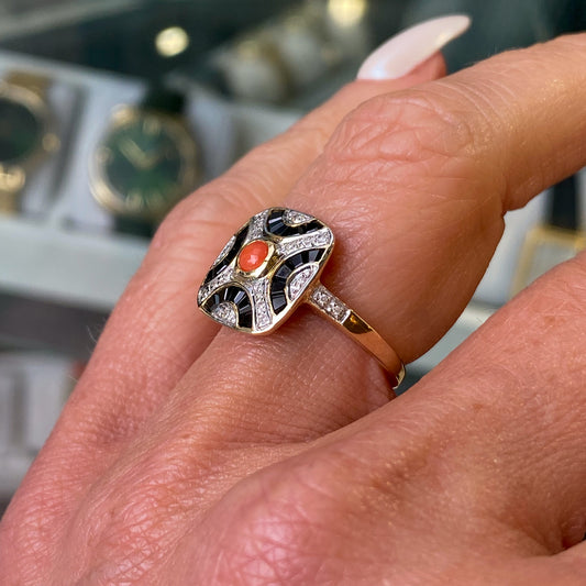 9ct Gold Red Coral, Onyx & Diamond Ring