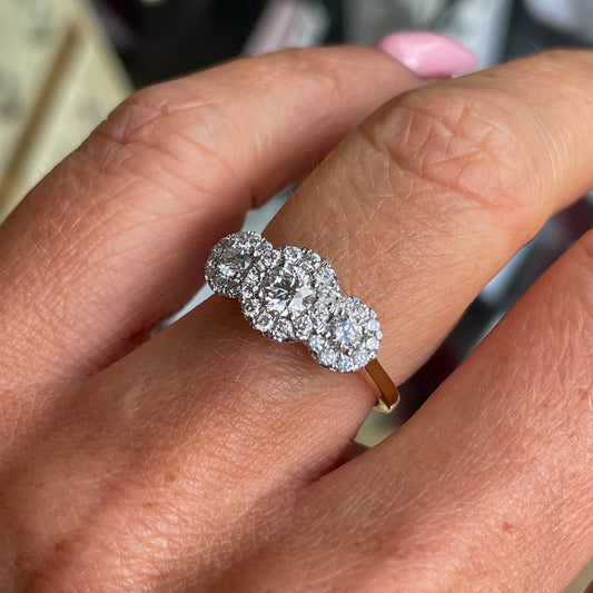 18ct Gold 1.05ct Diamond Trilogy Halo Ring | Diamond Shoulders