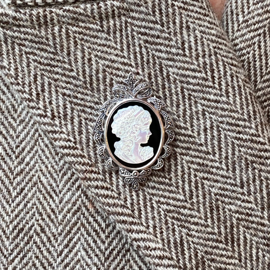 Silver Marcasite, Onyx & Mother of Pearl Cameo Brooch