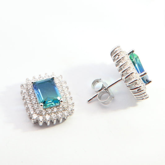 Silver Aqua Blue & CZ Statement Halo Stud Earrings