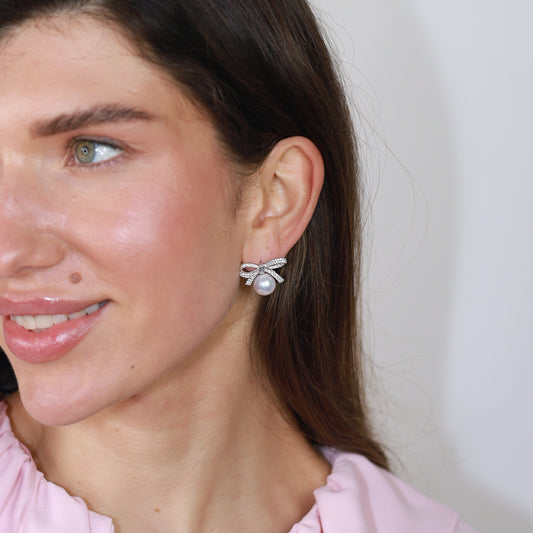 Silver Pearl & CZ Bow Stud Earrings