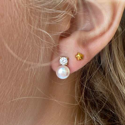 9ct Gold Freshwater Pearl & CZ Double Stud Earrings