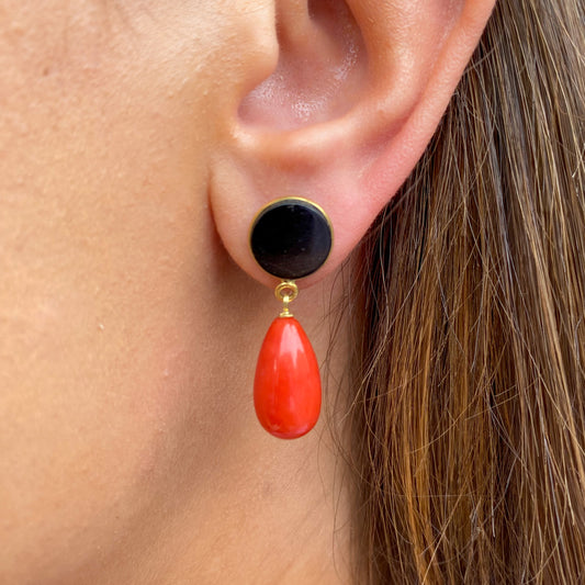 18ct Gold Onyx & Red Coral Drop Earrings | 30mm