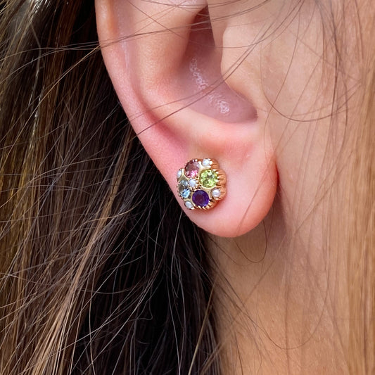 9ct Gold Amethyst, Pink Tourmaline, Blue Topaz, Peridot & Pearl Stud Earrings