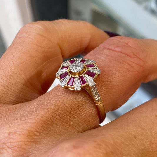 9ct Gold Ruby & Diamond Deco Ring