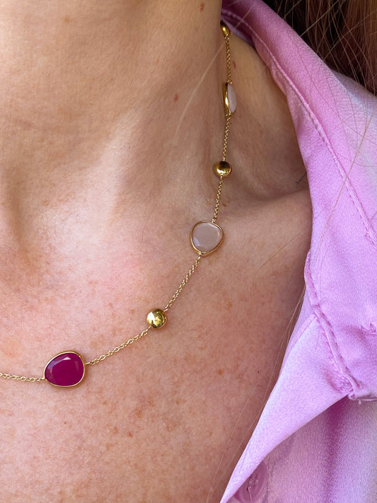 9ct Gold Rubellite, Rose Jade & White Jade Puffed Necklace