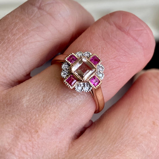 9ct Rose Gold Morganite, Ruby & Diamond Ring