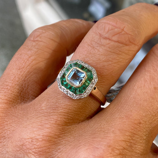 9ct Gold Blue Topaz, Emerald & Diamond Ring