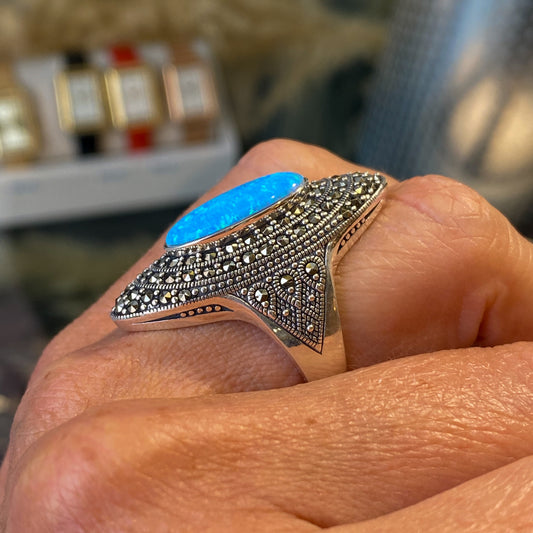 Silver Marcasite & Blue Opalique Elongated Oval Ring