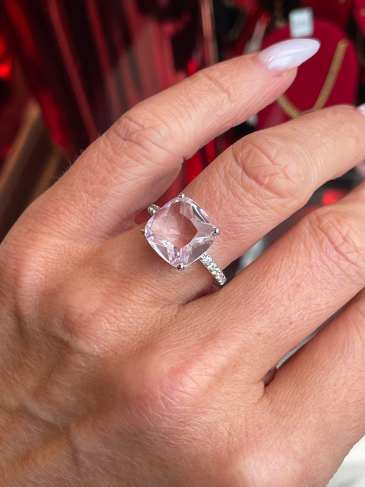 Silver Statement Cushion Solitaire Ring | Soft Pink