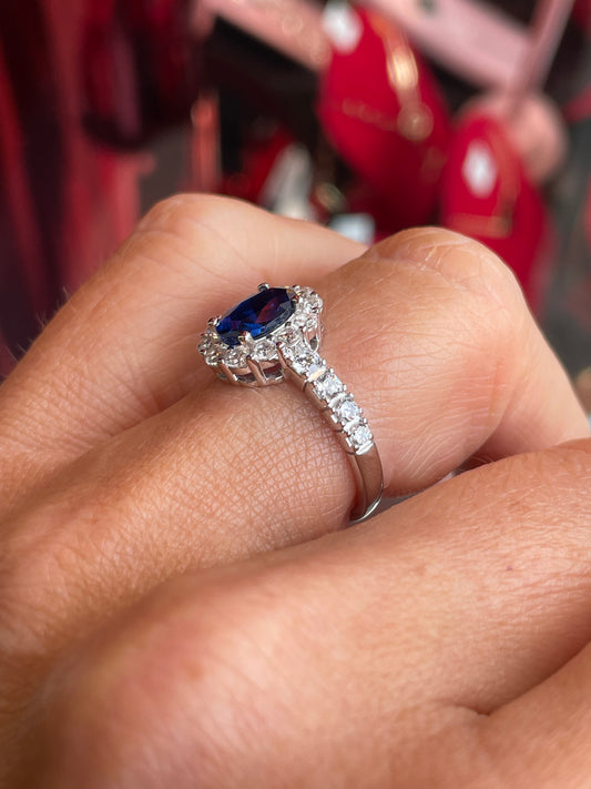 Silver Oval Diana Cluster Ring with Shoulders | Sapphire Blue
