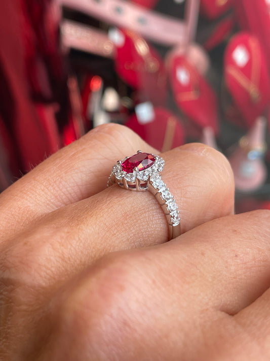 Silver Oval Diana Cluster Ring with Shoulders | Ruby Red