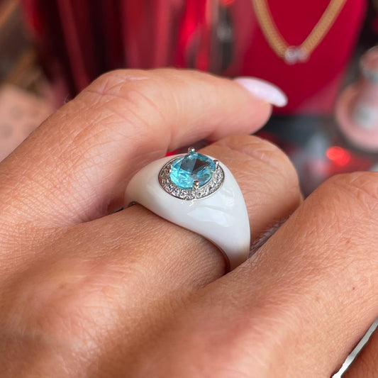 Silver Sky Blue CZ & White Enamel Ring