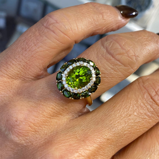 18ct Gold Peridot, Green Tourmaline & Diamond Ring