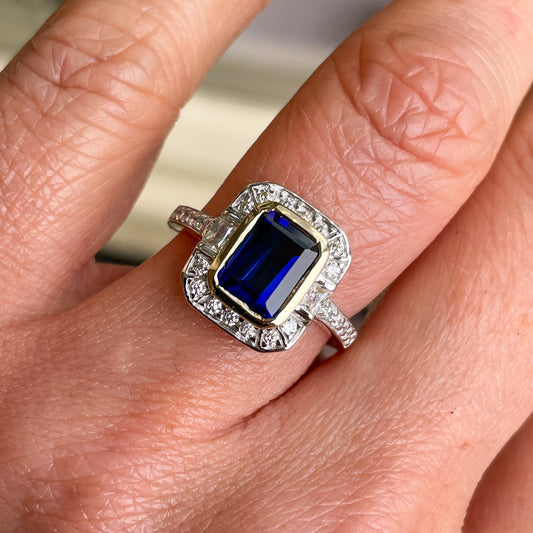 9ct Gold Created Sapphire & CZ Vintage Style Ring