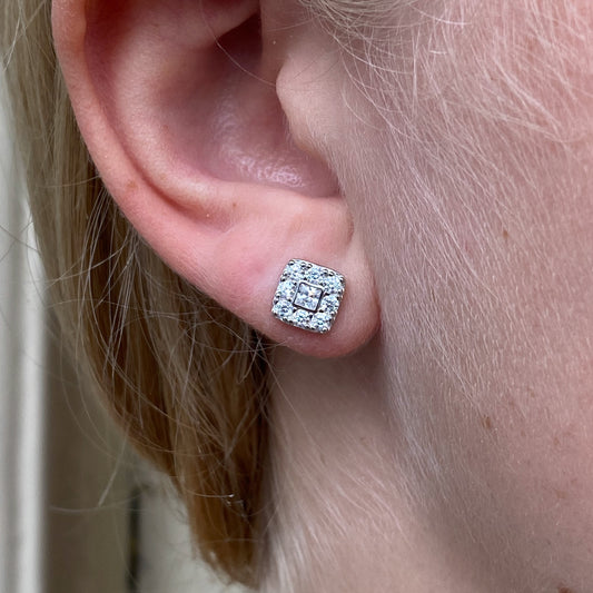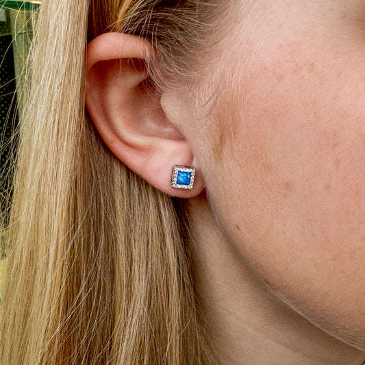 Silver Square Blue Opalique & CZ Halo Stud Earrings