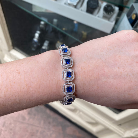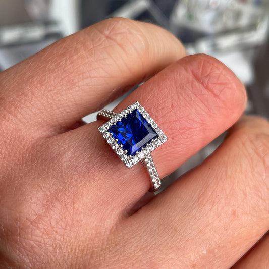 Silver Square Blue CZ Ring With Halo & Shoulders