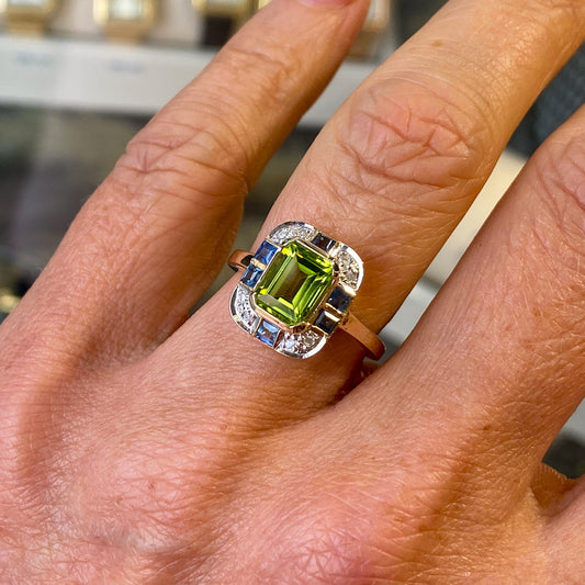 9ct Gold Peridot, Sapphire & Diamond Ring