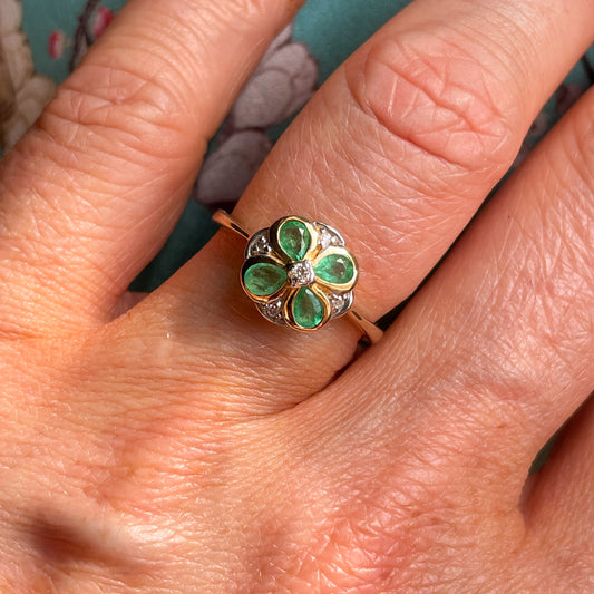 9ct Gold Emerald & Diamond Quatrefoil Ring