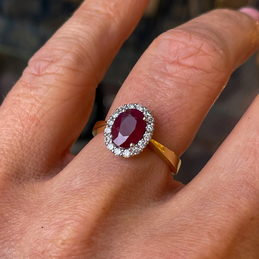 18ct Gold Ruby & Diamond Oval Cluster Ring | 1.69ct + 0.49ct