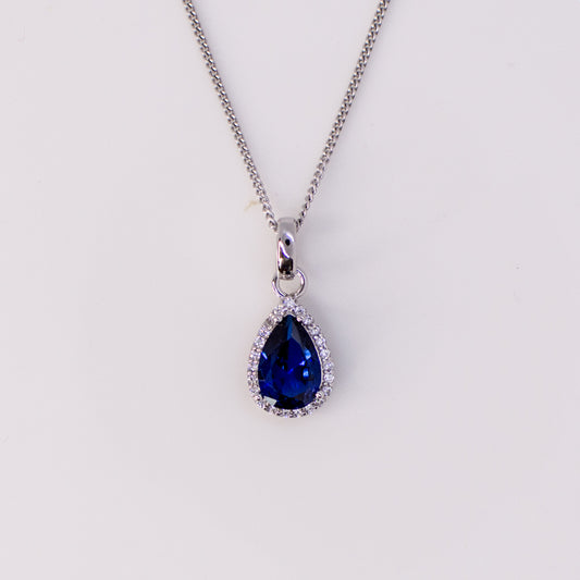Silver Created Sapphire & CZ Pear Pendant Necklace