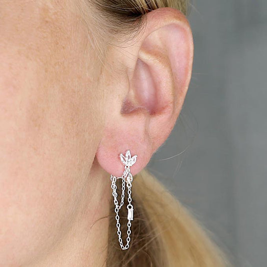 Silver CZ Lotus Drop With Chain Wrap Earrings