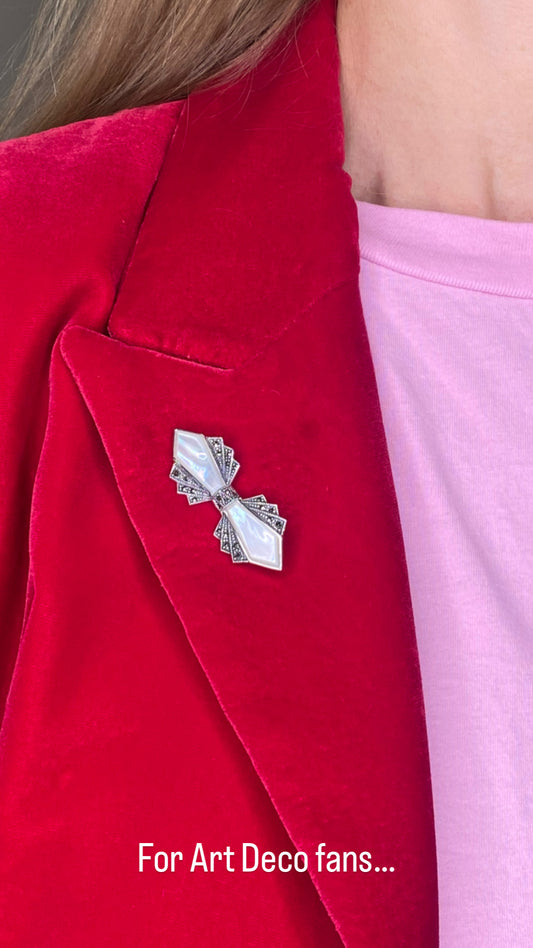Silver Marcasite & Mother of Pearl Deco Dickie Bow Brooch