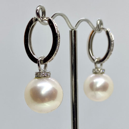 18ct White Gold 13mm Edison Pearl & Diamond Drop Earrings | 0.36ct
