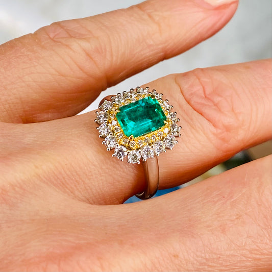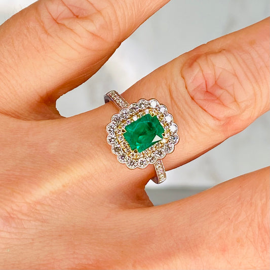 18ct White Gold Emerald & Diamond Double Halo Cluster Ring