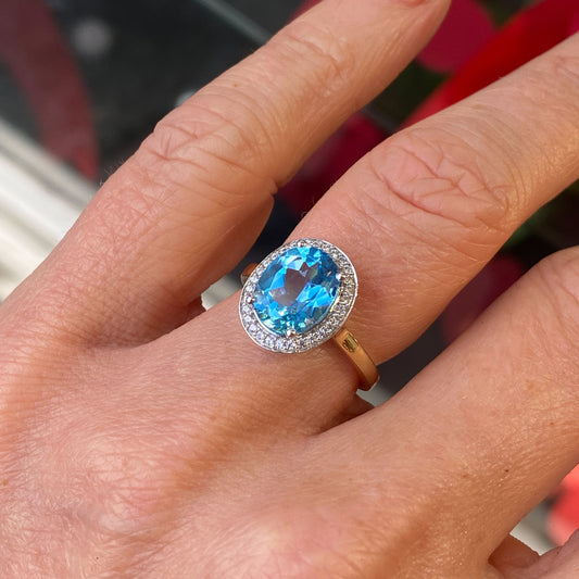 9ct Gold Blue Topaz & CZ Oval Cluster Ring