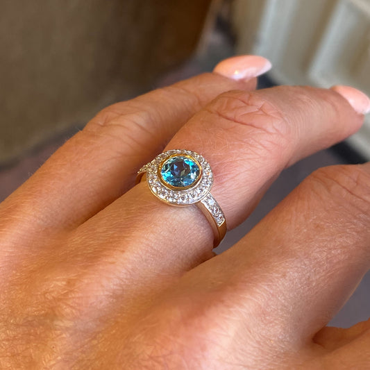 Sold out9ct Gold Blue Topaz & CZ Halo Ring